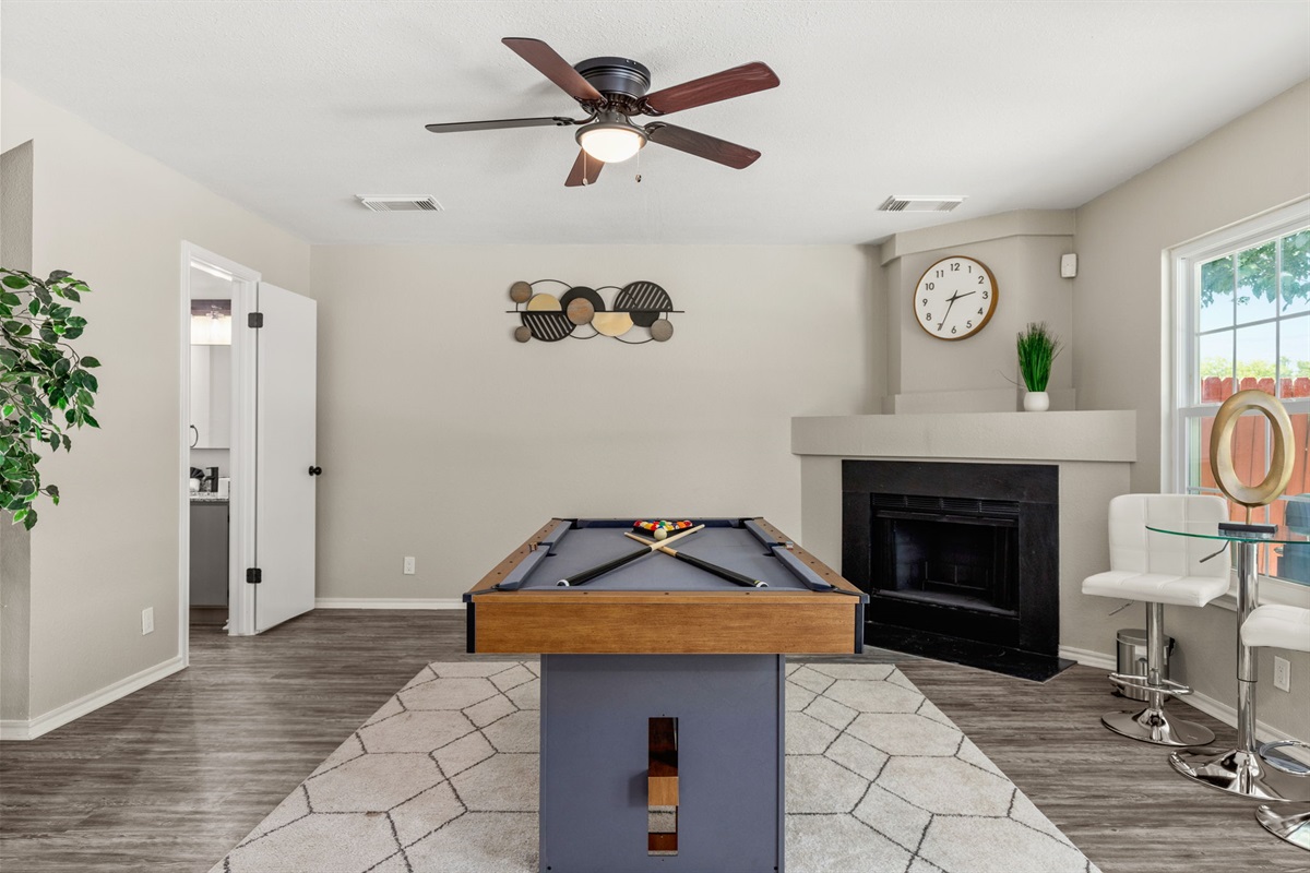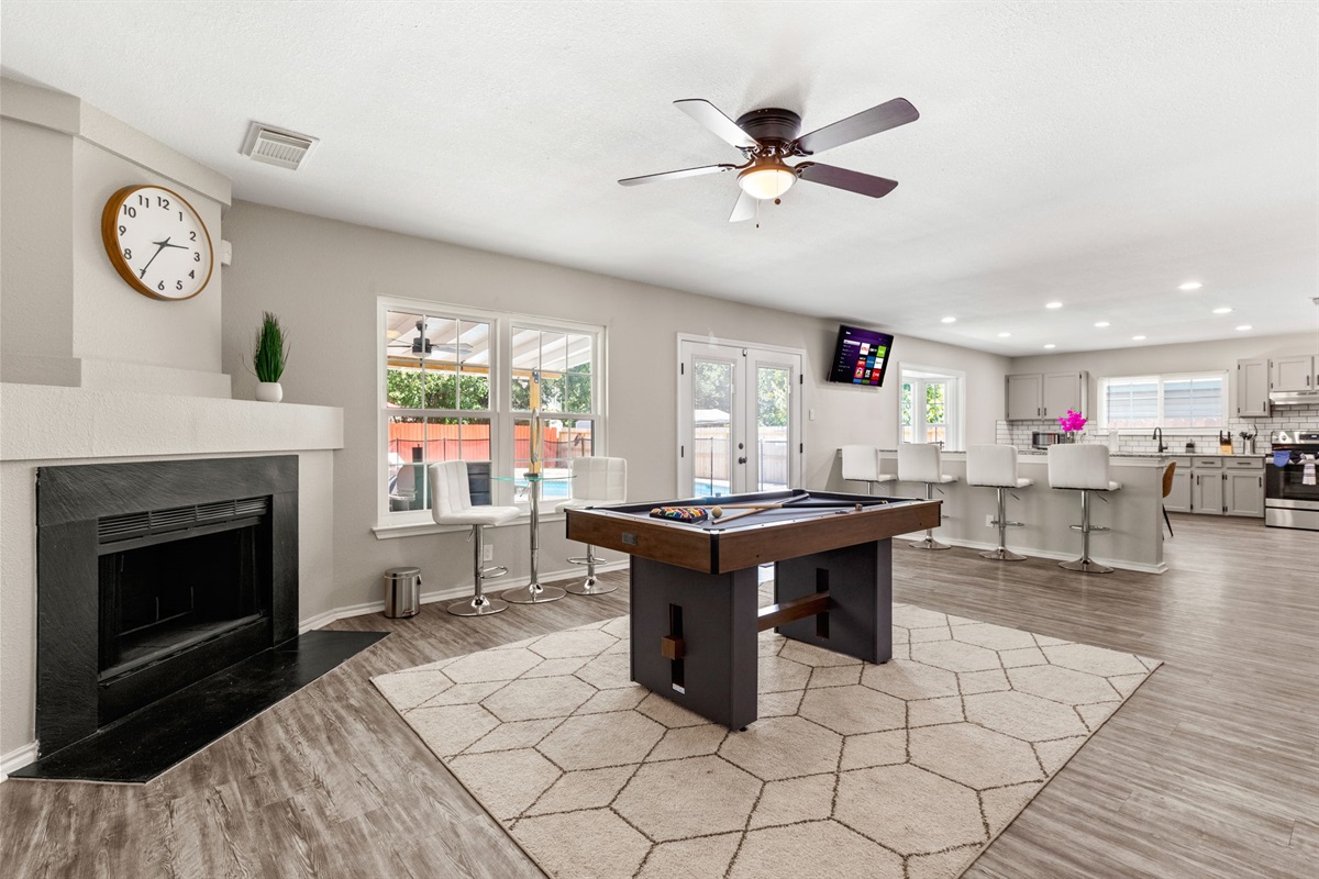5 Bedrooms • 3 Bathrooms (2 full, 1 half) 3 Baths (2 full, 1 half) • Sleeps 10-14Reside in your beautiful staycation that is extravagant in every detail, from the open concept living area to the chef kitchen fully equipped for your culinary adventures. Ascend the stairs to an activity-packed game lounge. Retreat to the exquisite suites accentuated by dual vanities, walk-in shower, and oversized closet. Large fenced backyard is ideal for entertainment with covered patio. Centrally located to Six Flags, Downtown, family-friendly activities, making this your perfect retreat!