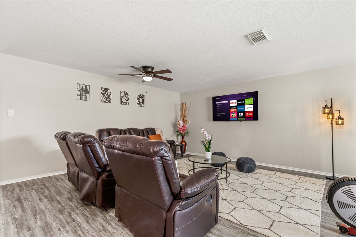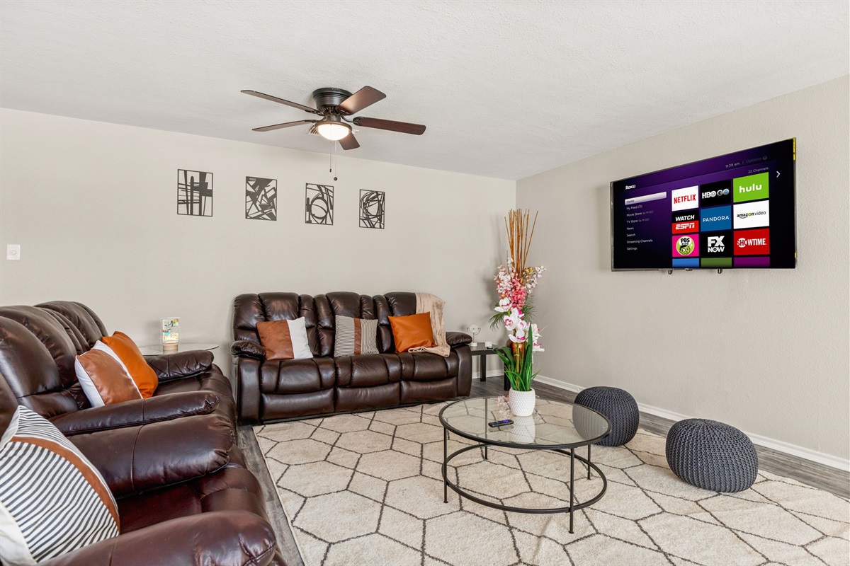 There's also plenty of dining space. We have a large family table as well as a really cool dining space in the indoor patio that overlooks the backyard and a TV! The living area also features a large 4k smart TV.